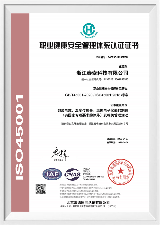 职业健康安全管理体系认证证书